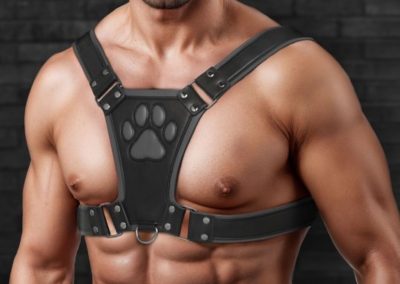 Thoughtfully designed for an adjustable fit, this harness wraps snugly around the shoulders and chest. Its durable, vegan leather construction, complete with a prominent paw print design, ensures you look good as you rough-house with other pups or serve your handler.